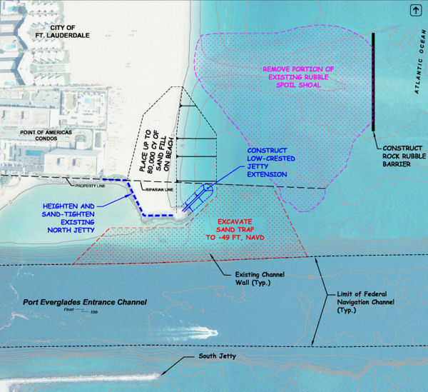 This project is intended to establish infrastructure at Port Everglades Entrance to facilitate periodic sand bypassing at the inlet which presently is a complete barrier to natural littoral drift along this area of the Broward County shoreline. The concept of sand bypassing at Port Everglades Entrance for the purpose of providing sand to the shoreline south of the inlet has been considered since the mid-1960’s. Not until recently, however, has the construction of a sand bypass project been shown to be an economically feasible component of Broward County’s regional beach management program. Olsen Associates, Inc. is the Engineer-of-Record for the planning, design, permitting, construction and monitoring of a sand bypass project at Port Everglades. A designed, the project will include the construction of a sand trap, improvements to the Port Everglades north jetty, and accommodation of periodic sand transfer every 2 to 3 years. To date, OA has completed a detailed feasibility study, performed project permitting and work with Broward County and the local communities to formulate and implementation approach that will provide a functional project while minimizing the effects of project related activities to surrounding communities. The project is planned for construction in 2012-13.