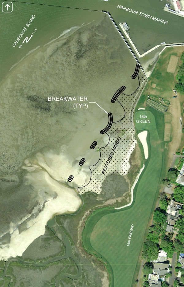 Olsen Associates, Inc. is the Engineer-of-Record for a shoreline stabilization and marsh restoration project adjacent to the 18th Green of Harbour Town Golf Links on Calibogue Sound at Hilton Head Island, SC. The project, which is required to address high shoreline retreat rates and extensive spartina marsh loss, will include the construction of six detached rock breakwaters, sand fill, and the planting of more than 3 acres of Spartina alternifloramarsh grass. To minimize impacts to the highly developed residential community, golf course, and golf course operations, all equipment and materials will be transported to the project site by barge and all work will be performed from water and a floating plant. The project, a first of its kind in the State of South Carolina, will be monitored for shoreline performance and marsh grass success.